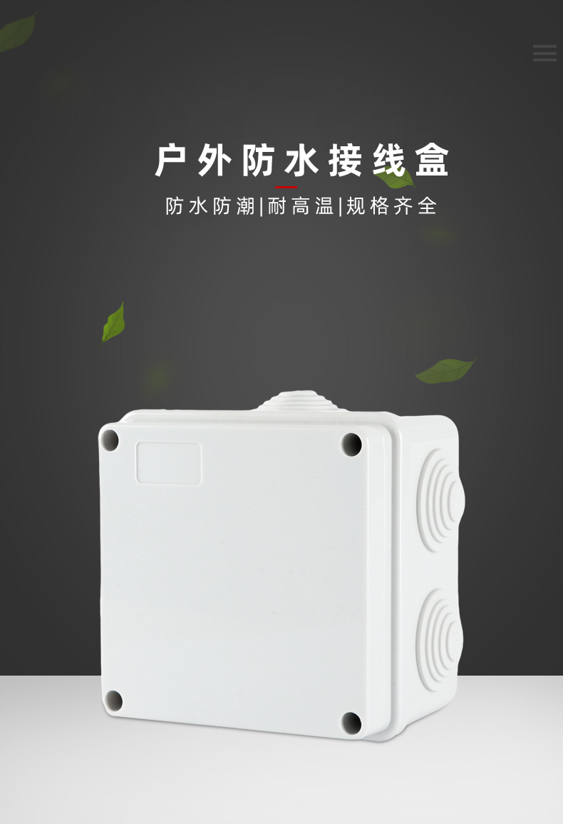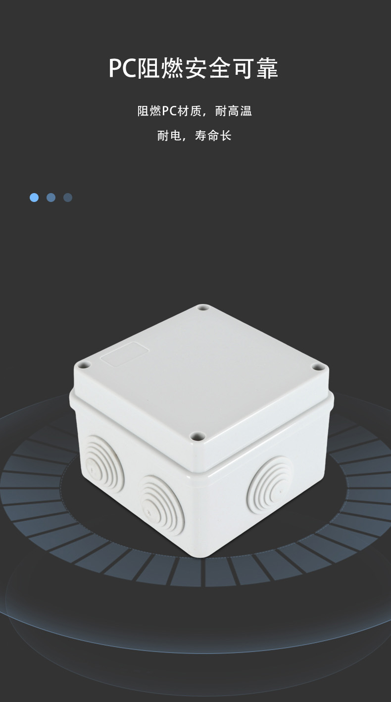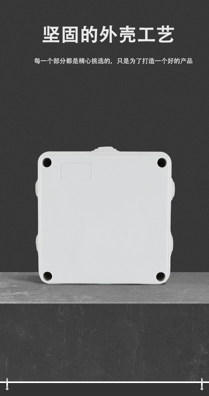 尺寸:100×100×50(mm)多重密封/安全防水 防水IP等級 (IP44)可供選材料(常ABS)ABS阻燃、PC,合金材PC阻燃安全可靠/耐高溫/耐電/壽命長每一個部分都是精心挑選的,只是為了打造一個好的產(chǎn)品