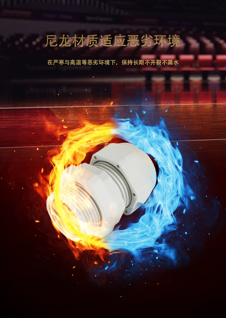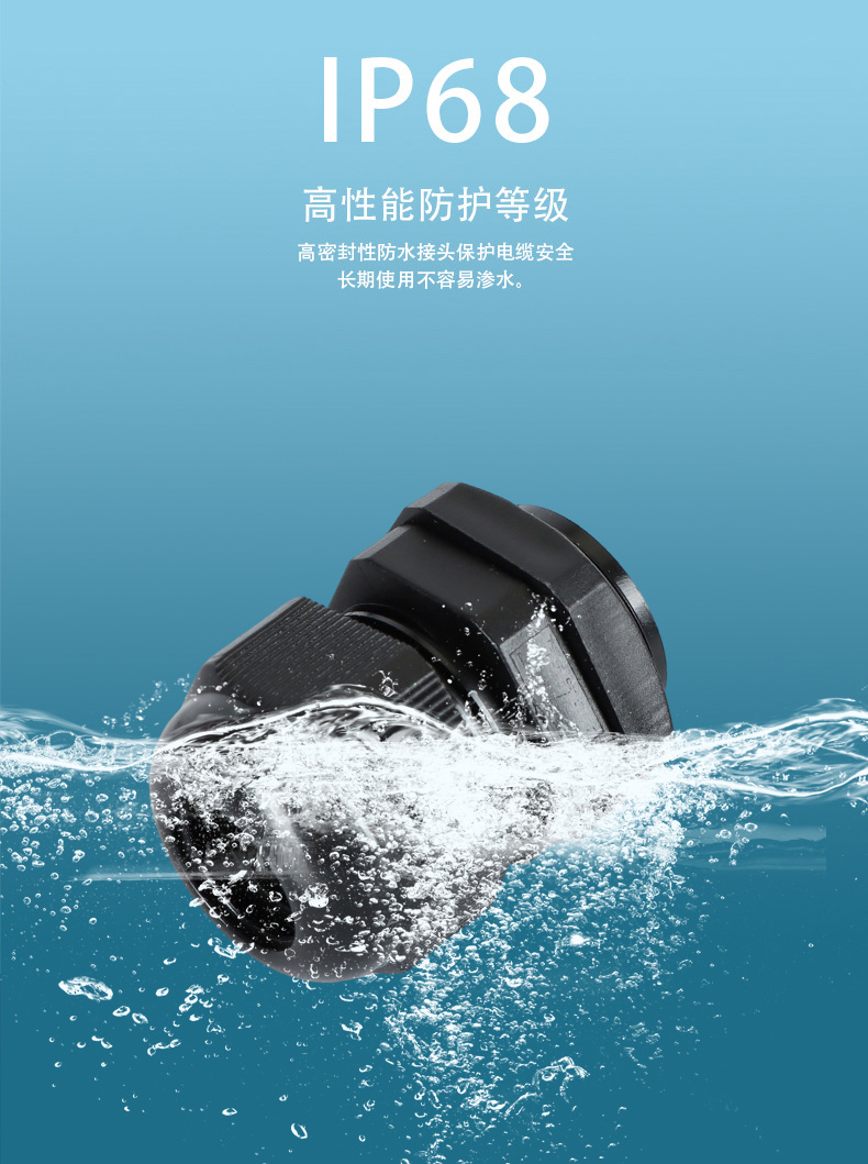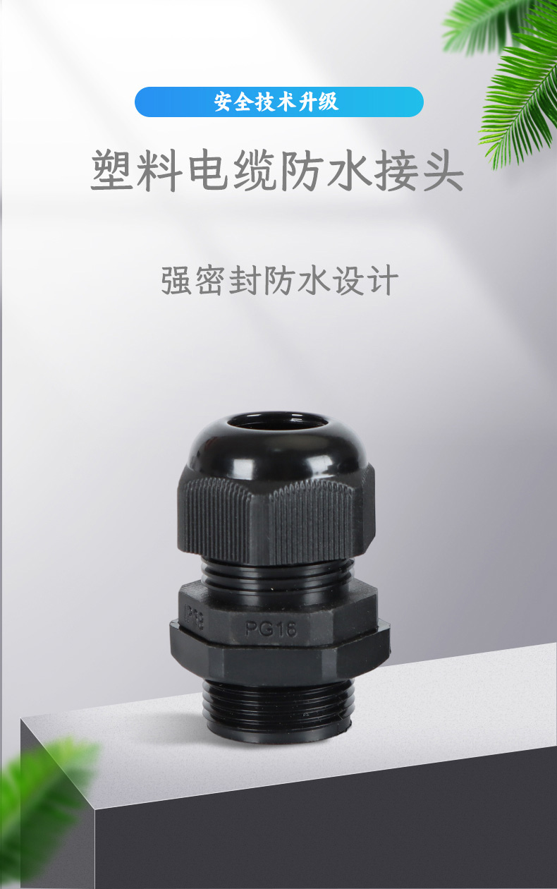 尼龍材質(zhì)適用惡劣環(huán)境紅、灰、黑、深灰、白、藍 六種顏色常規(guī):黑、灰兩種顏色,其它顏色需要定做在嚴寒與高溫等惡劣環(huán)境下,保持長期不開裂不漏水高密封性防水接頭保護電纜安全,長期使用不容易滲水