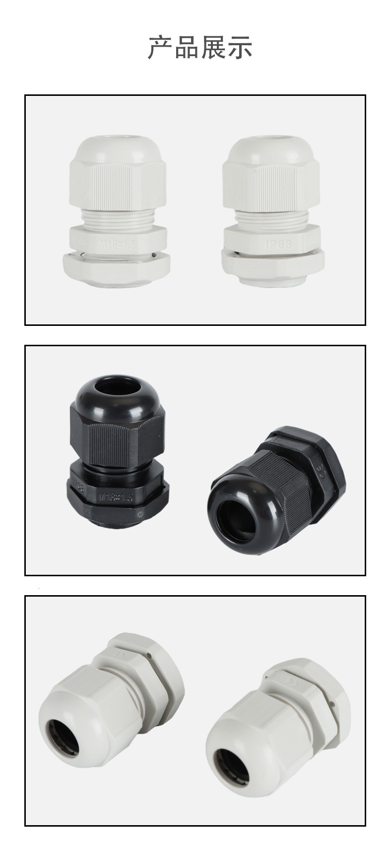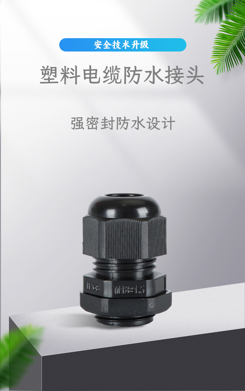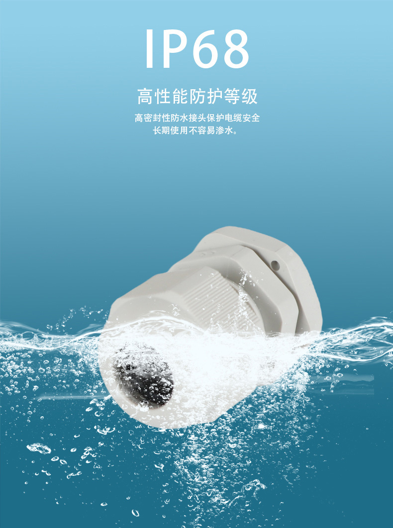 尼龍材質(zhì)適用惡劣環(huán)境紅、灰、黑、深灰、白、藍(lán) 六種顏色常規(guī):黑、灰兩種顏色,其它顏色需要定做在嚴(yán)寒與高溫等惡劣環(huán)境下,保持長(zhǎng)期不開裂不漏水高密封性防水接頭保護(hù)電纜安全,長(zhǎng)期使用不容易滲水