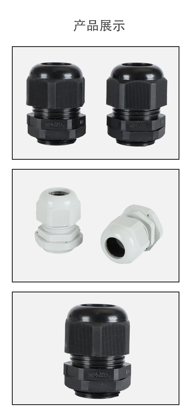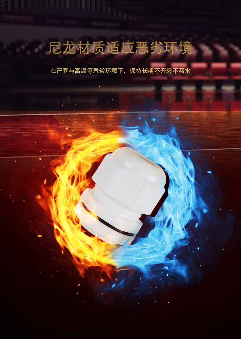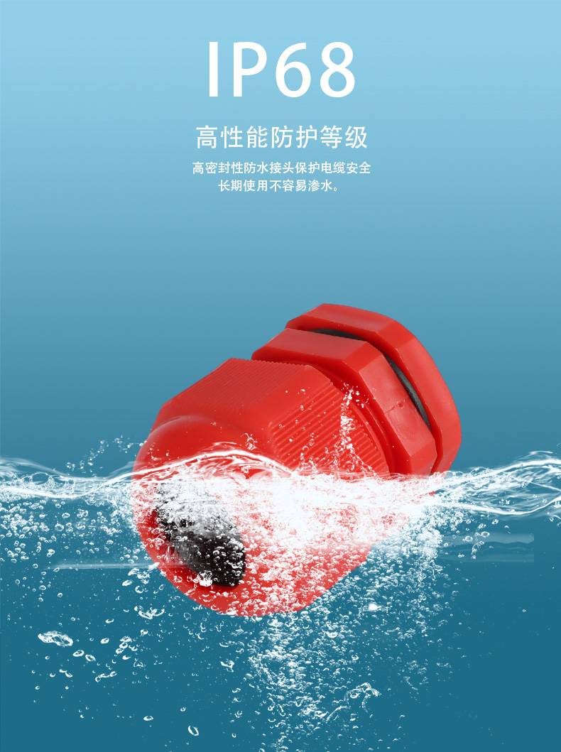 尼龍材質(zhì)適用惡劣環(huán)境紅、灰、黑、深灰、白、藍 六種顏色常規(guī):黑、灰兩種顏色,其它顏色需要定做在嚴寒與高溫等惡劣環(huán)境下,保持長期不開裂不漏水高密封性防水接頭保護電纜安全,長期使用不容易滲水