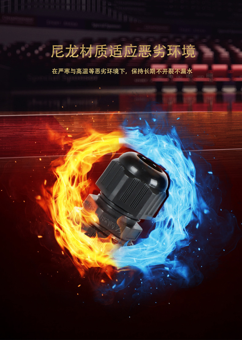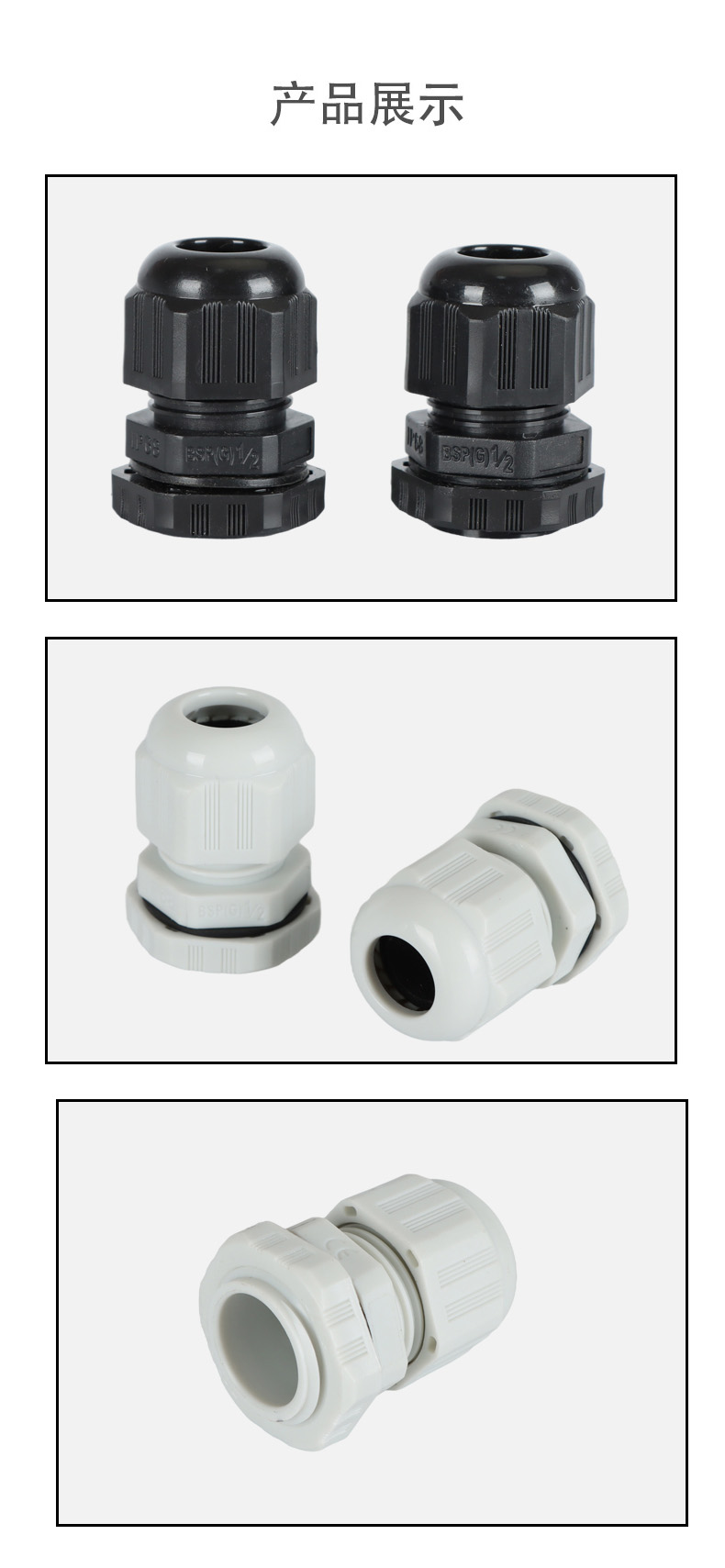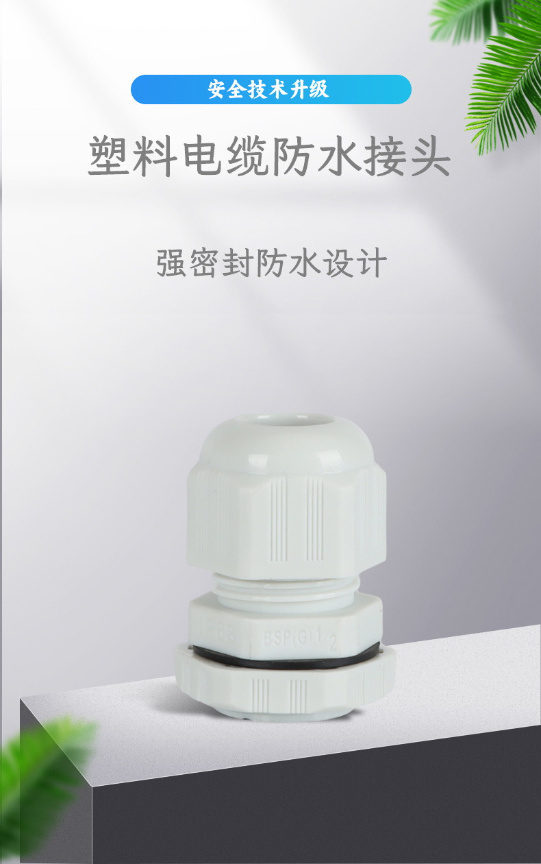 尼龍材質(zhì)適用惡劣環(huán)境紅、灰、黑、深灰、白、藍(lán) 六種顏色常規(guī):黑、灰兩種顏色,其它顏色需要定做在嚴(yán)寒與高溫等惡劣環(huán)境下,保持長(zhǎng)期不開裂不漏水高密封性防水接頭保護(hù)電纜安全,長(zhǎng)期使用不容易滲水