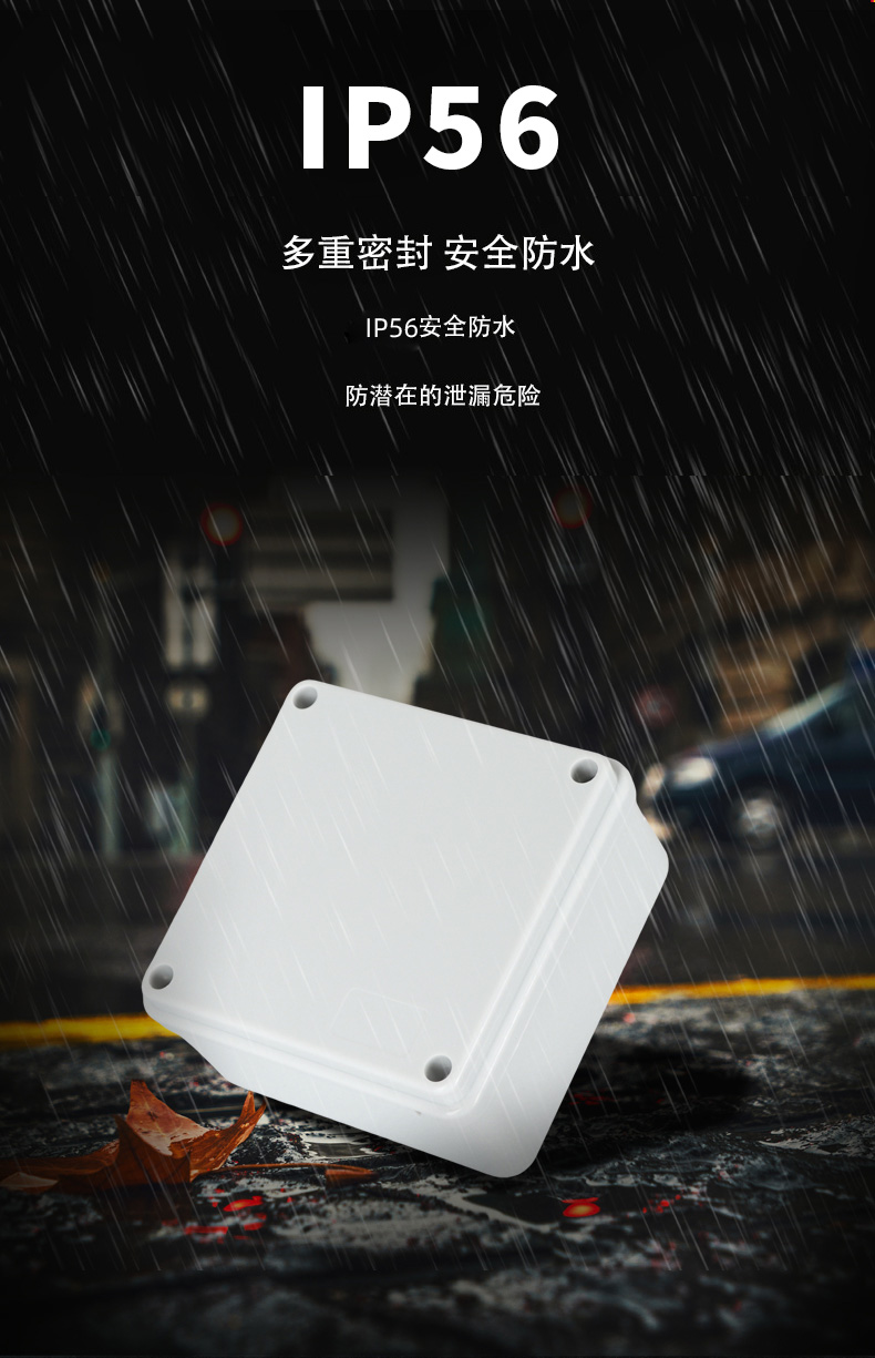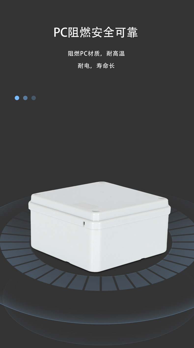 尺寸:100×100×50(mm)多重密封/安全防水 防水IP等級 (IP44)可供選材料(常ABS)ABS阻燃、PC,合金材PC阻燃安全可靠/耐高溫/耐電/壽命長每一個(gè)部分都是精心挑選的,只是為了打造一個(gè)好的產(chǎn)品