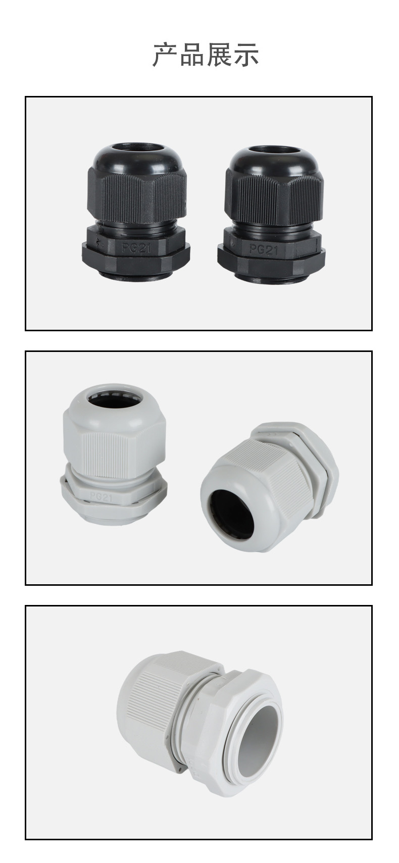 尼龍材質(zhì)適用惡劣環(huán)境紅、灰、黑、深灰、白、藍 六種顏色常規(guī):黑、灰兩種顏色,其它顏色需要定做在嚴寒與高溫等惡劣環(huán)境下,保持長期不開裂不漏水高密封性防水接頭保護電纜安全,長期使用不容易滲水