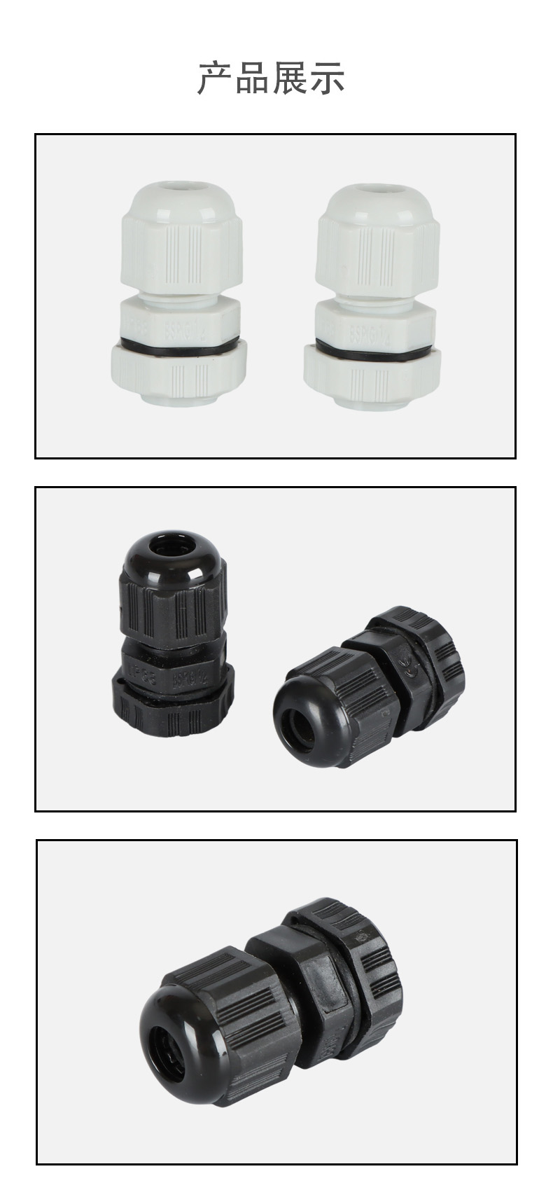 尼龍材質適用惡劣環(huán)境紅、灰、黑、深灰、白、藍 六種顏色常規(guī):黑、灰兩種顏色,其它顏色需要定做在嚴寒與高溫等惡劣環(huán)境下,保持長期不開裂不漏水高密封性防水接頭保護電纜安全,長期使用不容易滲水
